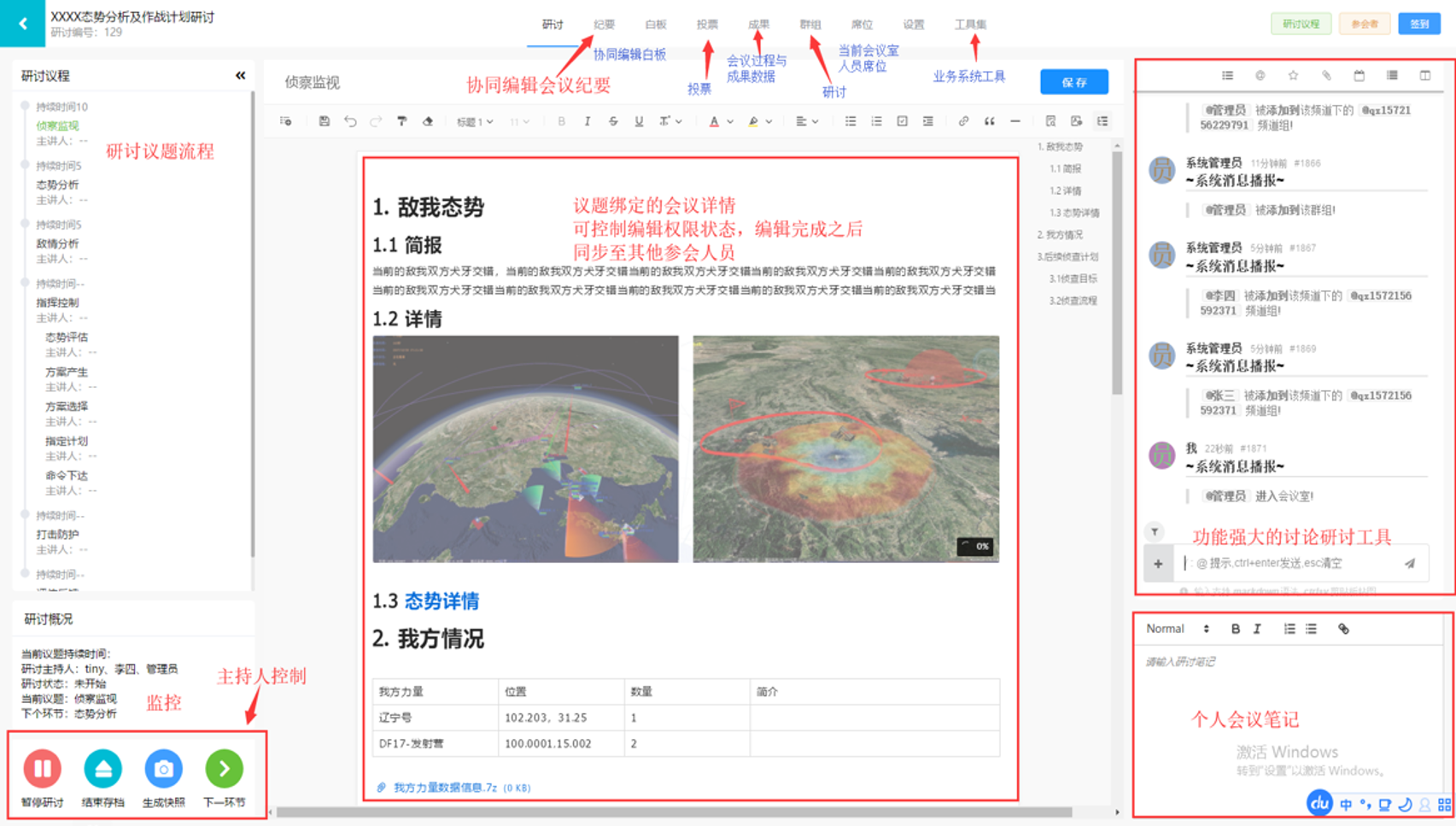以高層研討廳、低層研討廳、作戰(zhàn)模擬與訓練演習為研究對象,根據(jù)軍事戰(zhàn)爭需要,以軍事任務為牽引,組成結(jié)構(gòu)為基礎,對每個組成部分進行功能需求分析,建設成一個具有功能相對完善、結(jié)構(gòu)相對完整,各部分關(guān)系相互協(xié)調(diào)的研討廳體系。